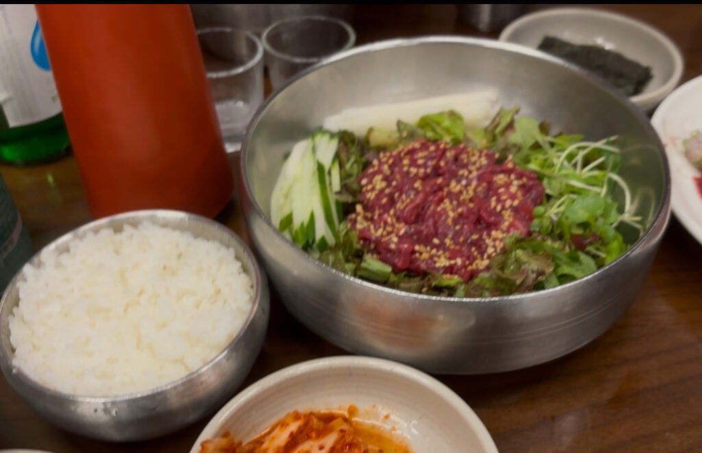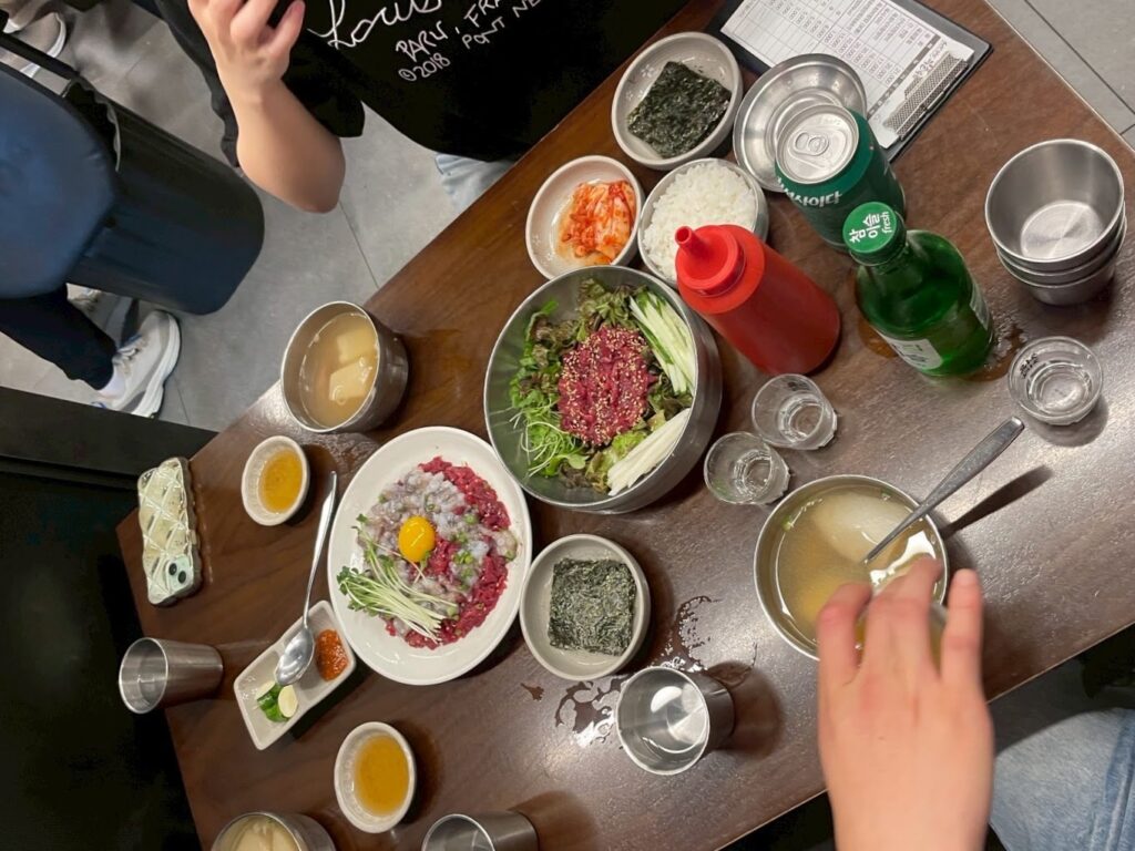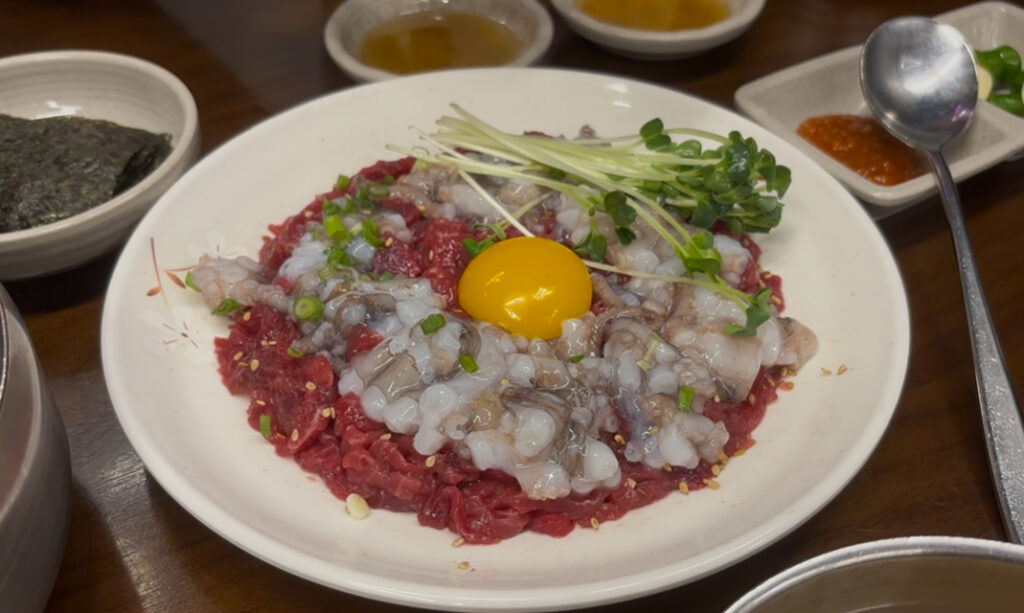 その中でもずっと気になっていたのが、ミシュランを何年も受賞している有名店「プチョンユッケ」。ユッケ好きとしては絶対に外せないお店です!ドキドキしながら入ってみると、観光客だけじゃなく地元の人もたくさんいて大賑わい。もうこの時点で期待値MAXでした。